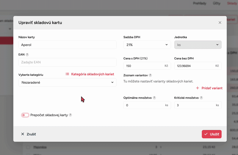 Variants allow you to keep different packages or names under one stock card. Each variant has its own name, optionally an EAN, and a conversion to the base unit of the main card.