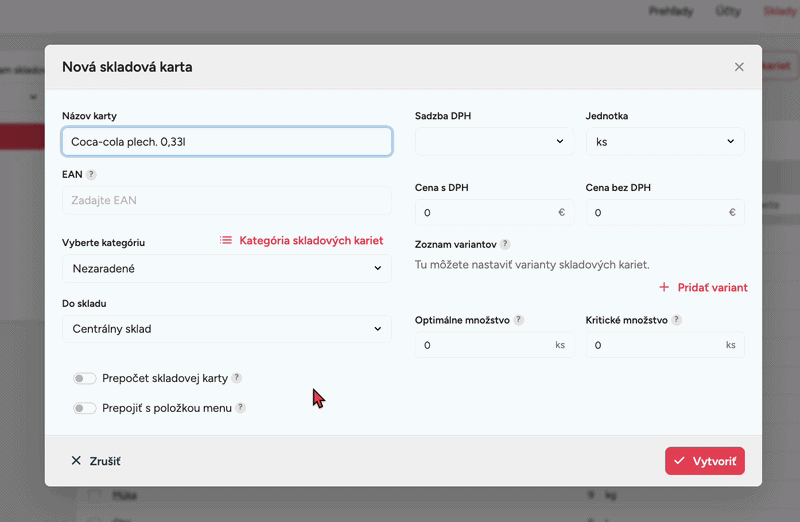 Stock card is a single ingredient or item in your stock (e.g. Egg, Coca‑Cola can, Flour 1 kg). For each card you track the current quantity, unit of measure (pcs, kg, l), VAT rate, purchase price and any variants or aliases.