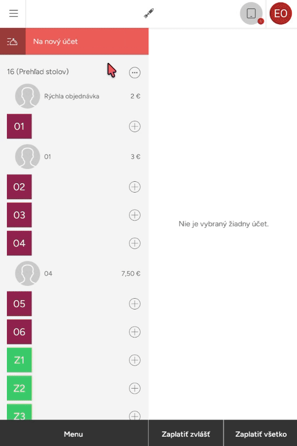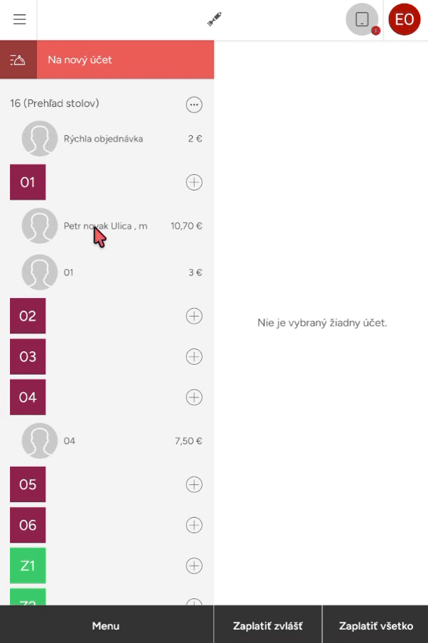 - Objednávku potom môžete odložiť na stôl (v administrácii v sekcii Podniky – Stoly si môžete vytvoriť stôl Rozvoz alebo Vyzdvihnutie) alebo ju rovno zaplatiť. Účet bude uložený pod menom zákazníka.