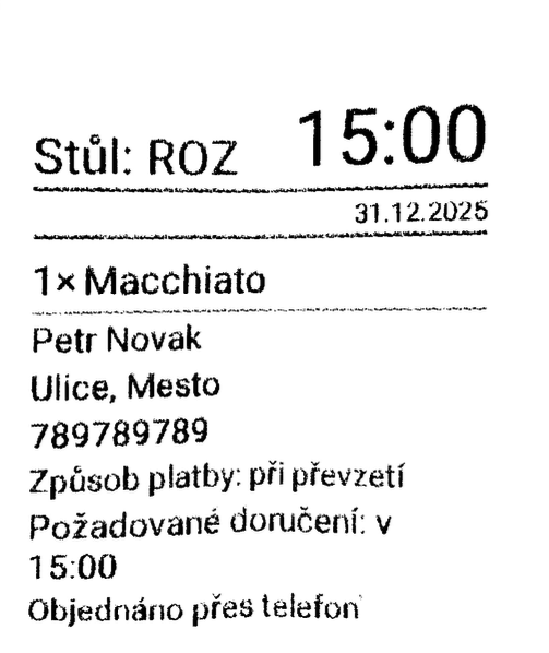 Ak máte nastavenú tlač objednávok do kuchyne, po výbere produktov sa v kuchyni vytlačí bon pre kuchára, na ktorom nájdete aj informácie o objednávke vrátane mena zákazníka a času vyzdvihnutia.