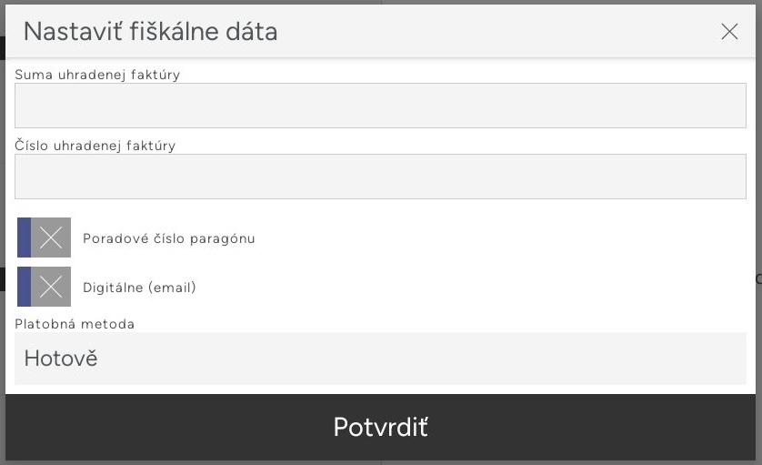Zobrazí sa vám tabuľka, v ktorej je potrebné vyplniť sumu uhradenej faktúry a číslo faktúry (ktoré máte na vystavenej faktúre z vášho účtovného systému). Môžete zadať poradové číslo paragónu alebo zvoliť digitálne potvrdenie (potvrdenie o úhrade bude zaslané na e-mail). Taktiež si môžete vybrať platobnú metódu, ktorou bola faktúra uhradená.