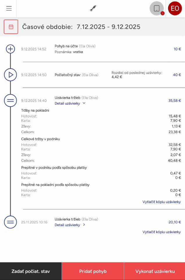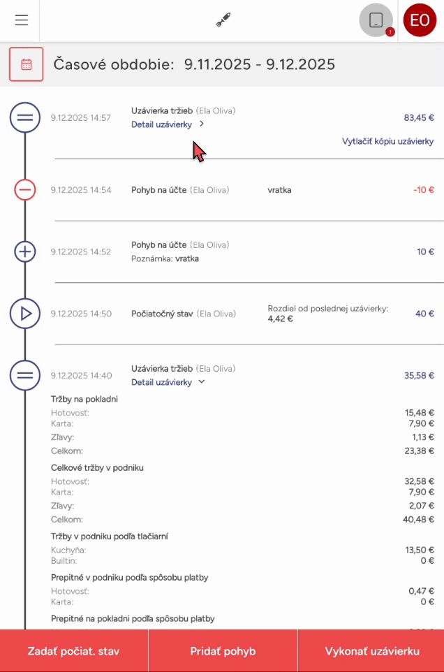 • Ak máte používateľskú rolu majiteľa alebo prevádzkového, uvidíte celkovú históriu pohybov. V prípade rolí hlavného čašníka alebo nižších uvidíte v okne zoznam pohybov hotovosti za posledných 48 hodín.