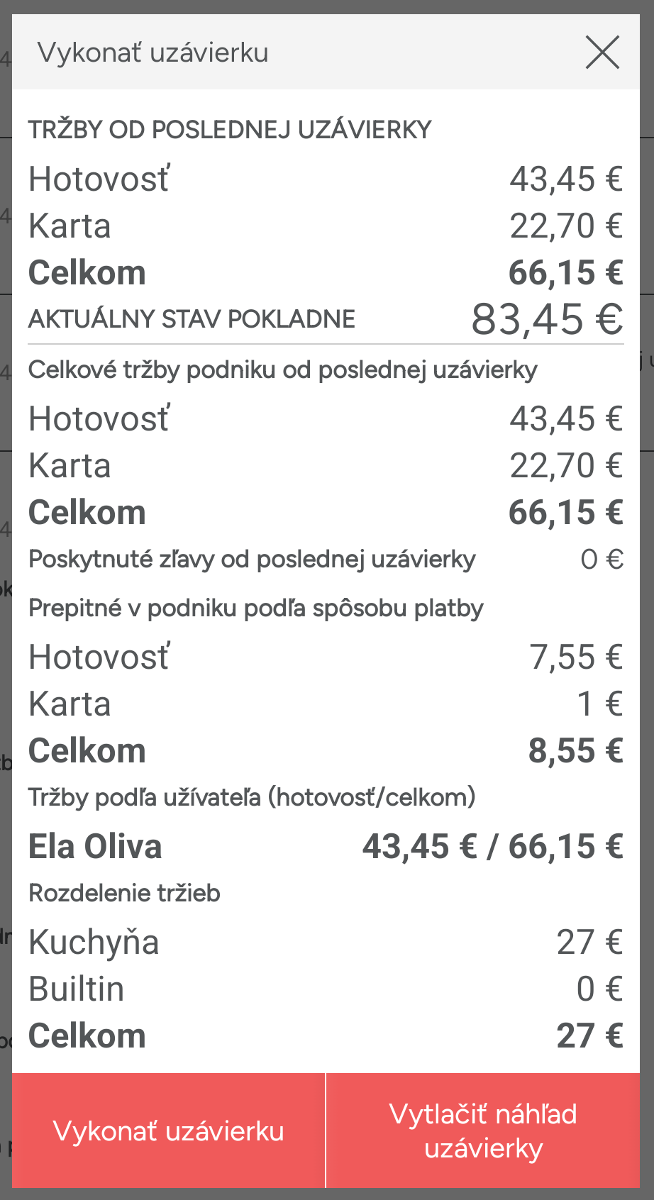 Uvidíte tu tiež prehľad zliav a prepitného podľa typu platby. Ak chcete zobraziť aj ďalšie informácie, môžete zmeniť nastavenia v administrácii v sekcii Nastavenie -> Uzávierka. Môžete napríklad pridať zobrazenie podľa tlače objednávok (za akú sumu boli tlače na bare a v kuchyni), podľa personálu alebo predaných produktov, ktoré sa vytlačia priamo na uzávierke.