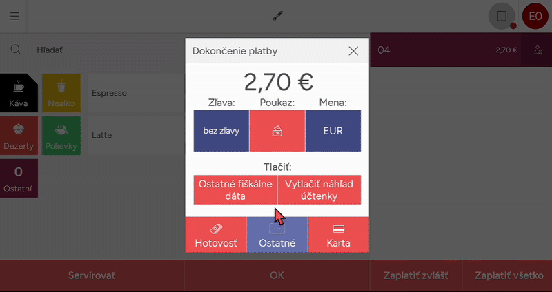 V prípade, že chcete zákazníkovi zaslať účtenku (platí aj pre paragón a úhradu faktúry) emailom, pri platbe zvoľte tlačítko Ostatné fiškálne dáta, kde zakliknete možnosť Digitálne (e-mail) a vyplníte e-mailovú adresu zákazníka.