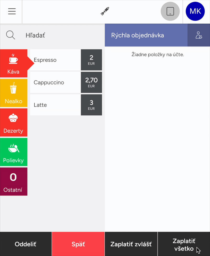 Kliknite na typ platby (hotovosť/kartou) – objednávka sa uzavrie a vytlačí sa účtenka.