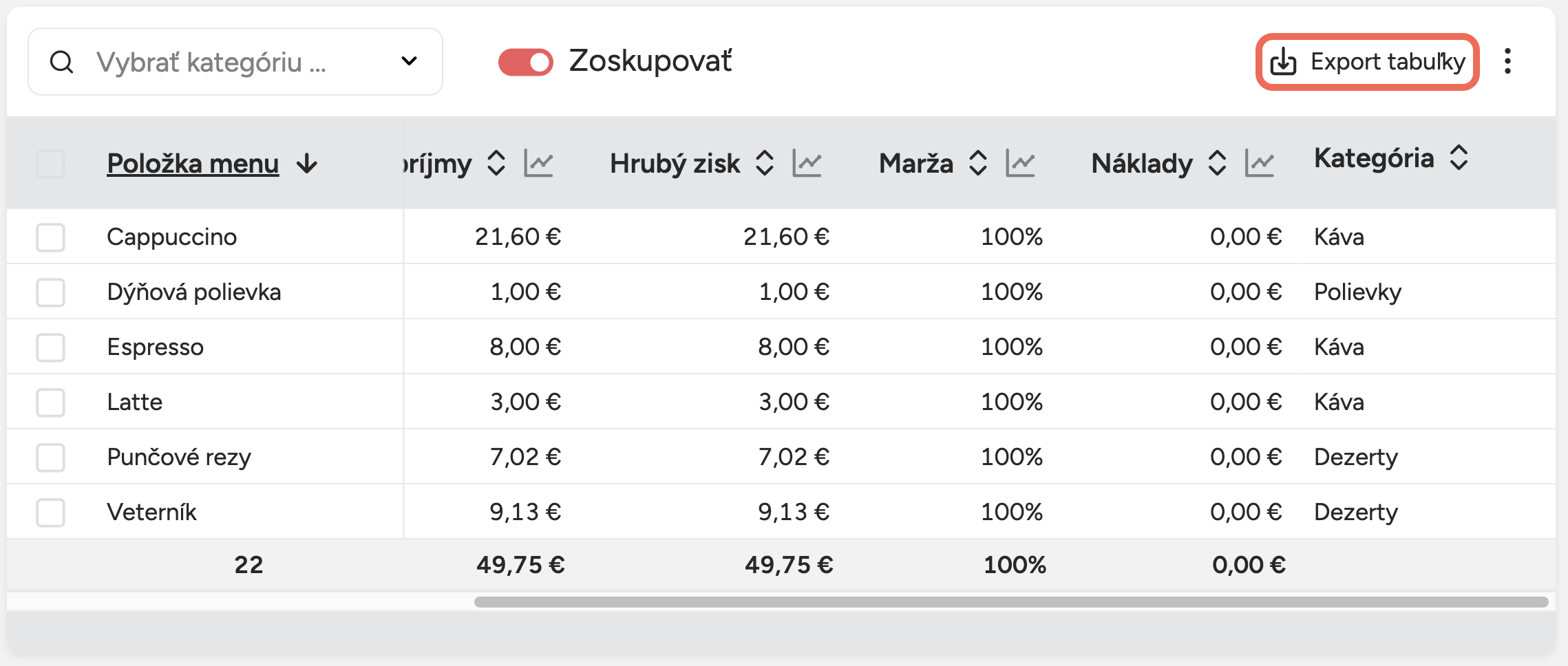 V sekcii Prehľady → Produkty nájdete prehľad o tom, ktoré produkty sa predávajú najviac a ktoré menej. Tento prehľad vám pomáha rýchlo identifikovať silné aj slabé položky ponuky, sledovať hrubé tržby, maržu a celkové náklady na jednotlivé produkty.