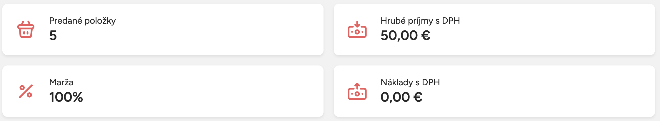 - Predané položky - zobrazuje celkový počet všetkých predaných produktov so štítkom v danom období. Ide o súčet všetkých položiek na účtoch, ktoré boli uzavreté a zaplatené.