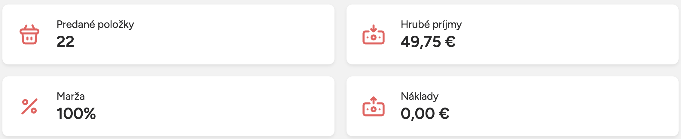 - Predané položky - zobrazuje celkový počet všetkých predaných produktov v danom období. Ide o súčet všetkých položiek na účtoch, ktoré boli uzavreté a zaplatené.