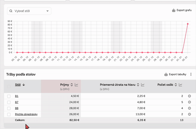 - Príjmy – celková suma prijatá na danom stole,