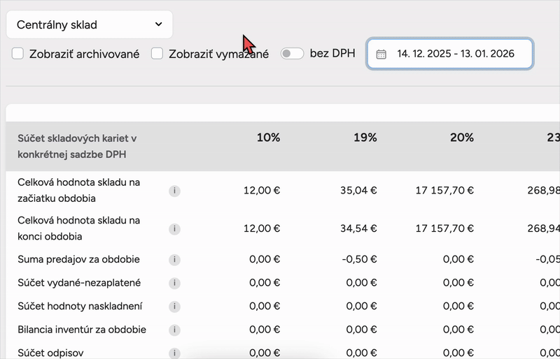 Údaje v prehľade sú zobrazované v nákupných cenách a slúžia predovšetkým na kontrolu skladového hospodárstva, nie na sledovanie tržieb.
