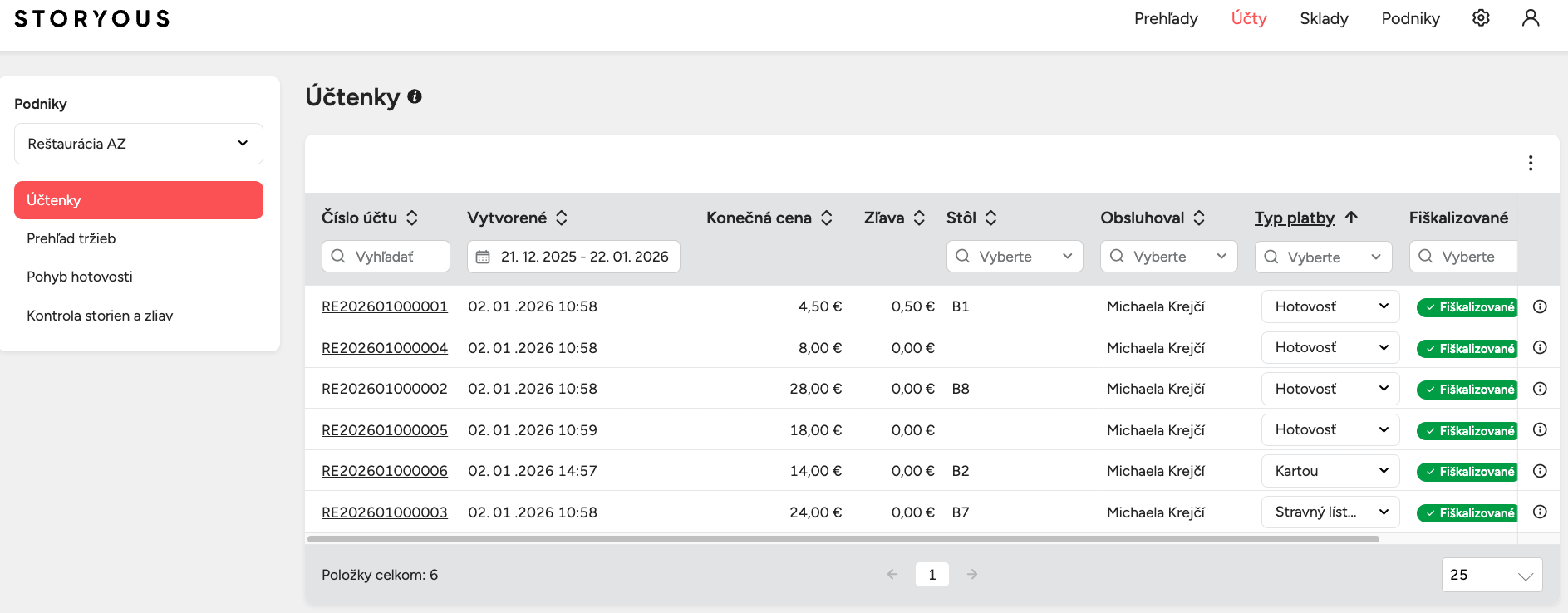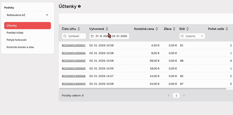 V sekcii Účty vo webovej administrácii Storyous sa nič nenastavuje – ide výhradne o prehľad a prácu s údajmi, ktoré sa automaticky synchronizujú z pokladne po uzavretí účtu. Nájdete tu kompletný zoznam všetkých účteniek, ktoré ste na pokladni vystavili, vrátane možností ich filtrovať, kontrolovať, upraviť typ platby a exportovať do účtovníctva.