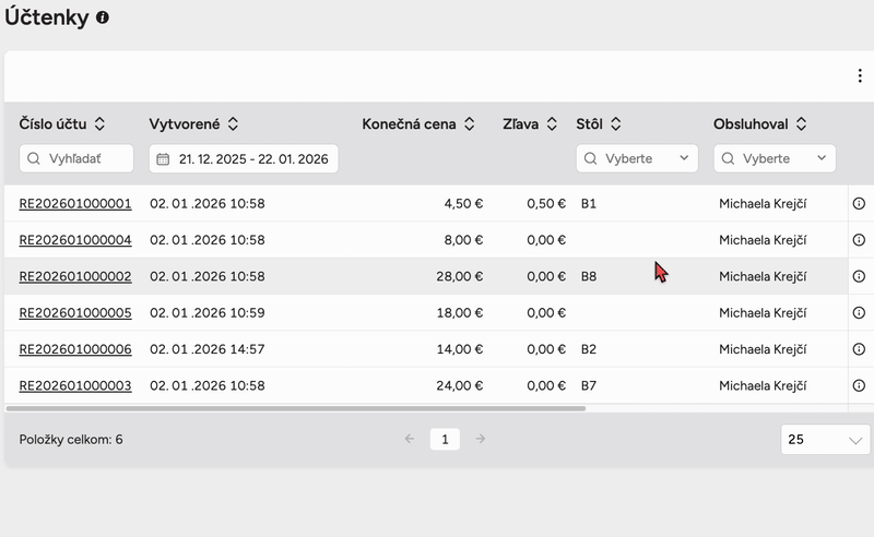 Hneď po otvorení karty Účtenky sa zobrazí tabuľka s účtenkami za zvolené obdobie. Každý riadok predstavuje jednu účtenku (alebo faktúru vystavenú z účtu).