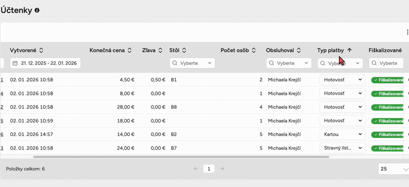 Pomocou filtrov tak viete oddeliť napríklad len externé objednávky zaplatené vopred, ktoré potrebujete odovzdať účtovníctvu, alebo si rýchlo pozrieť účtenky konkrétnej obsluhy.