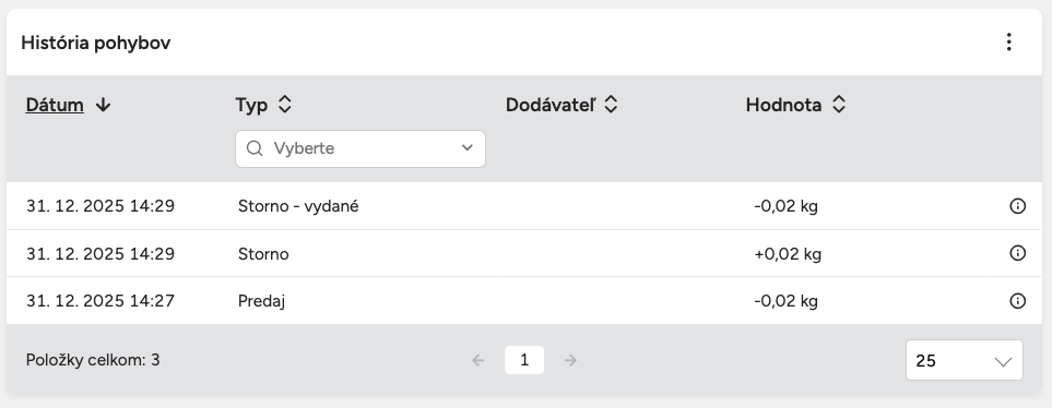 Vo výsledku je stav skladu znížený o 0,02 kg.