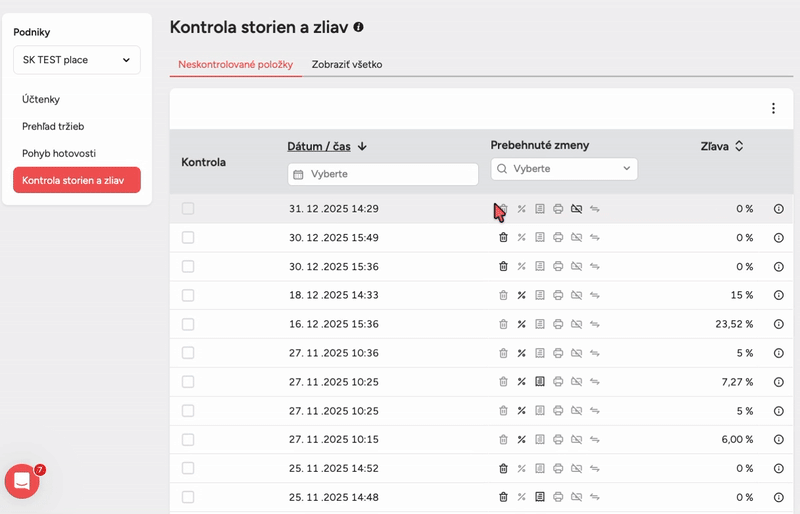Použitie tejto funkcie môžete dohľadať vo webovej administrácii v sekcii Účty → Kontrola storna a zliav . V stĺpci Prebehnuté zmeny vyberte filter Vydané – nezaplatené a kliknutím na (i) detail na konci riadku sa dostanete do priebehu účtu.