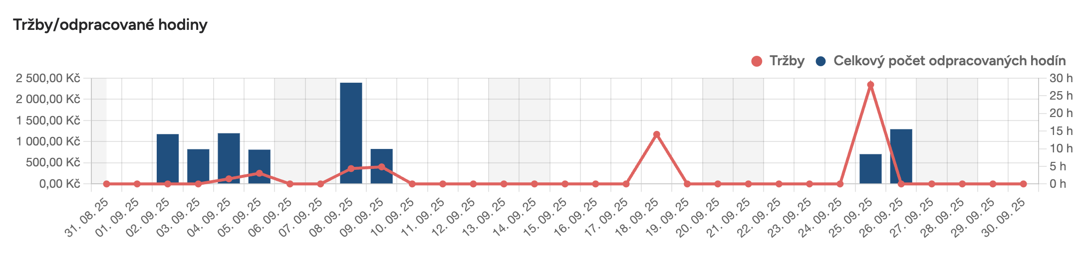 Graf zobrazuje kombináciu tržieb (modré stĺpce) a odpracovaných hodín (červená čiara).