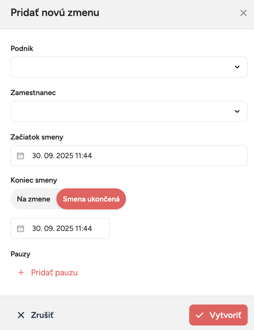 - Deň a čas začiatku/konce zmeny