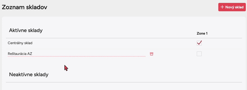 | Poznámka: Sklady nie je možné úplne zmazať – v systéme ich môžete len archivovať, aby zostala zachovaná história dokladov, inventúr a prehľadov, ktoré sú na daný sklad naviazané. |