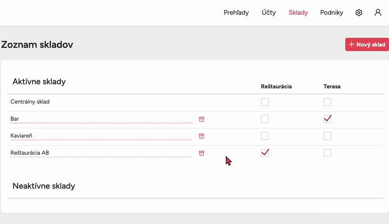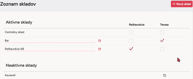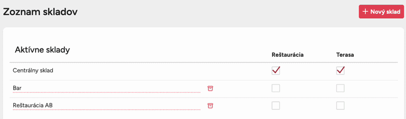 Ak vo svojej pokladni používate viac zón (napríklad osobitne bar, kuchyňu alebo terasu), v tabuľke Zoznam skladov pri každom sklade jednoducho zaškrtnete, z ktorého skladu sa má daná zóna odpisovať – všetky predaje z tejto zóny potom automaticky znižujú zásobu vo zvolenom sklade.